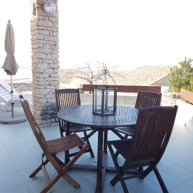 Terrasse vue mer 20 m² avec table et chaises et parasol
